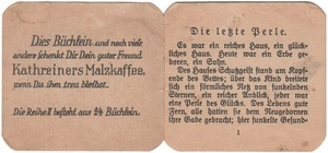 Zwölfseitiges Büchlein in eine quadratischen Format mit der Kurzgeschichte „Die letzte Perle“ von Hans Christian Anderson. Veröffentlicht als Verkaufshilfe für Kathreiners Malzkaffee