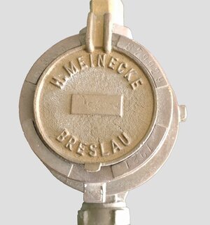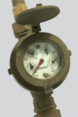 Der Wasserzähler/die Wasseruhr war im Winzerverein verwendet worden. Das Gerät ist aus Messing mit einer Glasscheibe über der Ablesefläche und einem Klappdeckel versehen. Der obere Teil mit der Ableseeinheit kann vom unteren Teil, Durchströmeinheit, abgeschraubt werden. Die beiden Anschlußgewinde sind gut erhalten. Der Wasserzähler/die Wasseruhr war im Winzerverein verwendet worden. Das Gerät ist aus Messing mit einer Glasscheibe über der Ablesefläche. Der Zähler trägt die Seiiennummer 879929.