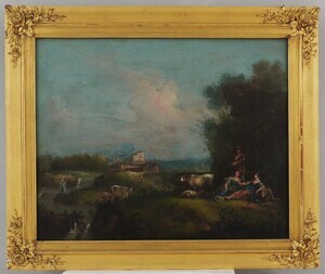 Ein sehr flacher Teller mit zwei Landschaften und zwei Vogeldarstellungen auf dem Relief. Der Blumen-Pressrand ist achtfach unterteilt. Der Rand ist mit verschiedenen Motiven bemalt: Gegenständig zwei Vögel auf Bäumchen. Gegenständig: a) Landschaft mit einem Reiter und zwei weiteren Männern b) Landschaft mit Ruine und zwei Männern. Randabschnitte durch Grate und darauf gelegtes Gold-Federmotiv gegliedert. Blütchensaum. Spiegel mit Löwenmarke JAH Ritzzeichen JHI.