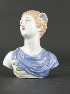 Merkurbüste mit dazugehörigem Sockel. Mannheimer Neuausformung Frankenthaler Porzellans. Merkur mit Flügel-Zeichen im fleischfarbenen Haar. Rote Lippen, blauer Umhang mit gelber Unterseite. Abgetreppter Sockel mit geschwungenen eingezogenem Mittelstück. Blätter in Purpur Gold verzieren die vier Ecken. Von Mannheimer Fabrik Benzonger (Mannheim-Käfertal) um 1900 als bewusste Nachahmung Frankenthaler Porzellans, unter Verwendung der über Grünstadt gekommenen Frankenthaler Formen hergestellt. Sockel mit Blaumarke CT.
