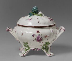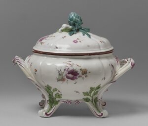 Eine große, runde Terrine mit vierpaßig geschweiftem Grundriss. Am Stand eingezogen, einschwingende Schulter, flachgewölbter Deckel auf vierpaßigem Grundriß. Gewundene Bandgriffe in Rocaillefüße auslaufend, die mit grünen Eichenlaubblättern besetzt und mit Purpur bemalt sind. Der Deckel trägt ein Arrangement von grüner Artischocke, Lauchstaude und geöffneter Erbsenschote als Knauf. Dekor: Deutsche Blumen und Streublumen. Blaumarke: Bekröntes CT.