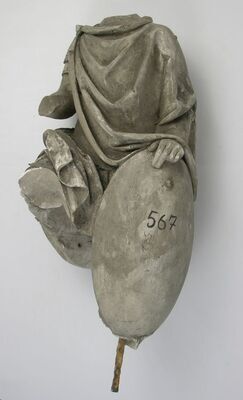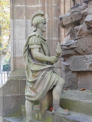 Torso eines römischen Soldaten mit einem Schild an seiner linken Seite. Auf dem Schild liegt die linke Hand des Soldaten. Der Daumen, der Mittel- und der Zeigefinger zeigen dabei nach unten. Der Daumen ist abgespreizt, der Ringfinger und der kleine Finger sind zur Handfläche hin eingedreht. Die Fingerstellung ähnelt einem Segensgestus. In der rechten Hand hielt er vermutlich eine Lanze. Der Kopf liegt dem Rumpf der Plastik bei. Die Figur steht ausgearbeitet auf dem Ölberg südlich des Domes zu Speyer. Gottfried Renn schuf die Figur 1856 im Auftrag des Domkapitels als Ersatz für die zerstörten gotischen Figuren aus dem 16. Jahrhundert von Meister Hans von Heilbronn.