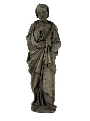 Maria in weitem, faltenreichem Gewand mit Kind, das auf ihrer linken Hand sitzt. Die rechte Hand hält das Jesuskind fest. Das Gewand wird mit einer Fibel am Hals zusammengehalten. Auf der rechten Seite des Sockels steht "Renn 1906".