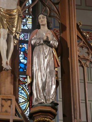 Gewandfigur des heiligen Johannes. Dargestellt ist ein jung anmutender, betender Mann mit langem, welligem Haar. Er steht barfuß auf einer runden Gipsplatte. Er trägt eine bodenlange, faltenreiche, antikische Tracht bestehend aus einer langarmigen Tunika mit weitem Halsausschnitt und Mantelpallium. Der vorne geöffnete Umhang ist nach oben gerafft und wird mit dem Gürtel oben gehalten, so dass er auf dem Rücken etwa bis zur Wade reicht. Die gefalteten Hände vor der Brust zeigen nach oben. Der Blick ist in Andacht gesenkt. Die nackten Füße werden nur teilweise von der bis zur Erde reichenden Tunika bedeckt. Der Betende steht auf einer Bodenplatte mit rauer Oberfläche, die die Erde symbolisieren soll. Der heilige Johannes ist in Holz gearbeitet und bunt gefasst Teil der Kreuzigungsgruppe am Hochaltar St. Mariae Himmelfahrt in Otterstadt.