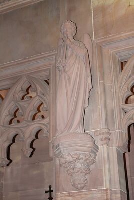 Figur eines aufrechtstehenden Engels, der die linke Hand zum Segensgruß erhoben hat. Er trägt ein bodenlanges Kleid mit Faltenwurf und hat einen etwa knielangen Mantel über die Schultern gelegt, der keine Schließen hat und den er in der linken Ellenbeuge sowie zwischen dem rechten Unterarm und der Hüfte klemmt und so rafft. Er ist mit sehr kurzen, stark gelockten Haare dargestellt, was ihn modern erscheinen lässt. Eine in Stein ausgearbeitete Skulptur des Engels befindet sich im Inneren der Chapelle Toussaint in Straßburg.