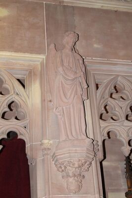 Gewandfigur eines aufrechtstehenden, eine Flöte spielenden Engels auf einem achteckigen Sockel mit bearbeiteter Oberfläche. Gekleidet ist er in eine bodenlange Tunika und einen Umhang, der lose um den Körper gewunden ist, ihn jedoch nicht vollständig bedeckt. Das rechte Bein ist nach hinten gestellt. Unter der Tunika ragt der vordere Teil des rechten, nackten Fußes hervor. Das linke Bein ist abgewinkelt und etwas nach vorne gestellt. Die linke Fußspitze des nackten Fußes, dem eine Zehe fehlt, ragt etwas unter der Tunika hervor. Die angelegten Flügel überragen die Schultern und reichen nach unten über die Hüfte. Beim linken Flügel fehlt das obere Teil. Der Engel ist mit kurzem, lockigem Haar dargestellt, was ihn modern erscheinen lässt. Die Arm- bzw. Handhaltung und die Art, wie der Mund geformt ist, weisen auf einen flötenspielenden Engel hin. Die in Stein gefertigte Skulptur befindet sich in Straßburg in der Capelle Toussaint innen.