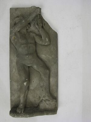 Ein jugendlich wirkender Jesus ohne Bart und mit Heiligenschein hält mit beiden Händen über der Brust ein Kreuz. Es verdeckt die Schließe des Mantels, der über beiden Schultern und über einem langärmeligen Untergewand liegt.
