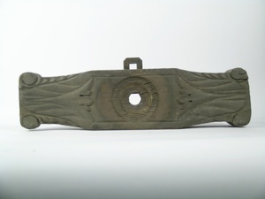 Vorderer Boden mit Traubenranken in Flachrelief geschnitzt. Volutenförmig geschwungener Riegel mit Schuppenbandzier. Lager in Flachrelief mit zwei stehenden gekrönten Löwen an den Seiten, in der Mitte eine Lilie. Traubenranken bunt gefasst. Lager gestrichen.