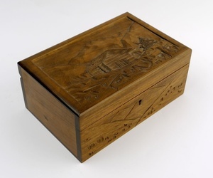 Geschnitzter vorderer Boden mit Monogramm unter einer Krone. Ein Blendtürchen mit einem von einer Messingschrauben gehaltenen Riegel gedeckt. Fässchen mit vier Messingreifen belegt. Gestellt auf dem Schauseiten mit Traubenranken geziert. Füße zu zwei Bogen geschwungen und mit kleinen Voluten abgeschlossen.