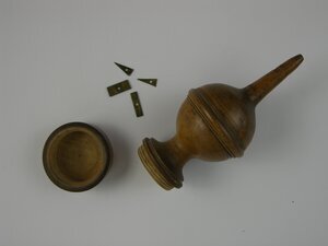 Mostwaage mit Zusatzplättchen und Futteral. Die Waage hat die Form einer Kugel mit kleinem zylindrischem Ansatz und einer aufgesetzten Spitze. Die vier Plättchen sind rechteckig und dreieckig. Der Fuß ist ebenfalls abnehmbar und enthält die Zusatzplättchen. Mostwaagen dieser Art wurden bis zur Entwicklung des Aräometers verwendet. Anhand des Einsinkens der Kugel in den Traubenmost konnte der Winzer den Zuckergehalt errechnen. Dazu legte man sofort nach dem Einsetzen die kleinen beigefügten Gewichtsteile auf das Stäbchen bis die Kugel und das Stäbchen zu einem festgelegten Punkt eintauchen. Dieser festgelegte Punkt richtet sich nach einer zuvor durchgeführten Probe. Bei dieser wurde die Kugel ohne Gewichtsteile in reines destilliertes Wasser gelegt. Der Flüssigkeitsspiegel markierte den festgelegten Punkt. Aus der Summer der aufgelegten Gewichtsteile ließ sich der Zuckergehalt errechnen. Später wurde statt der Gewichte eine feste Skala verwendet.