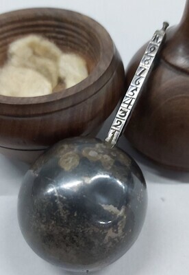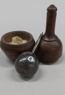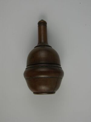 Eiförmiges Futteral mit umlaufendem Wulst in der Mitte, abgesetzter Boden, abgesetzte Röhrenspitze mit Knopf-Ende. Das Futteral ist mit einem innen liegenden Schraubgewinde versehen. Innen befindet sich die eigentliche Mostwaage: eine Hohlkugel aus Silber mit angesetzter Skala von 1-10. Solche Mostwaagen wurden bis zur Entwicklung des Aräometers verwendet. Anhand des Einsinkens der Kugel in den Traubenmost, konnte der Winzer den Zuckergehalt errechnen bzw. ablesen.