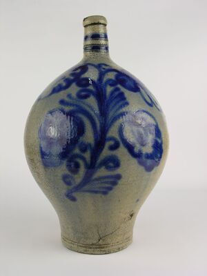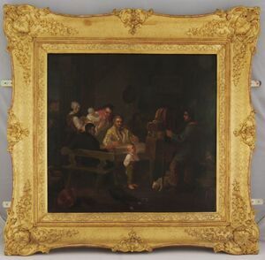 Die Vase ist urnenförmig mit profiliertem Fuß, ohne Deckel. An den Seiten zwei schlangenkörperartige Schleifengriffe, mit Blattansätzen. Am Übergang zum Fuß ein Akanthusblattkranz. Der Fond ist Meergrün. Die Ränder und Blätter in Gold. In zwei Vielpässen zwei Genredarstellungen in der Wirkung von Kupferstichen. a) Mann, Frau und zwei Kinder in einer Stube. b) Drei Frauen in einer Stube, eine bietet Fische aus einem Korb an. Blaumarke CT, VIII Ritzzeichen RZ.