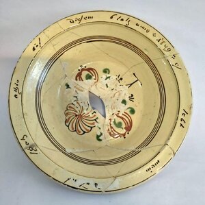 Die tiefe Schüssel ist außen mit einem reliefierten Korbrand verziert. Innen ist die Schüssel glatt. Der Gefäßkörper ist sowohl innen als auch außen mit deutschen Blumen bunt bemalt. Zentral innen ein Blumenbouquet, darum herum gestreut viele kleine Blüten und Blätter sowie ein kleinerer Blumenstrauß. Außen an der Schüssel drei kleine Sträuße, dazu Streublümchen. Der Fuß ist goldstaffiert. Blaumarke Löwe, eingestempelt PH und I.