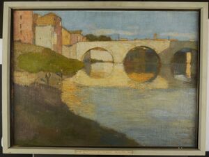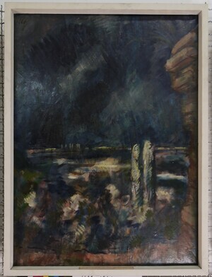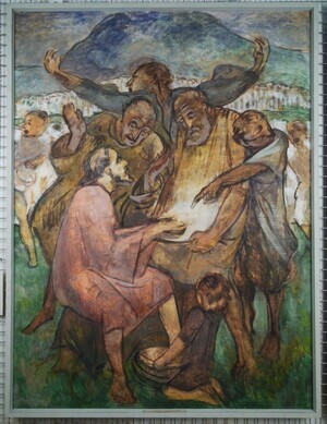 Christus liegt, den Körper in weiße Tücher gehüllt und den umwickelten Kopf auf ein Kissen aufgelegt, in einer Grabnische. Der Farbauftrag ist dünn. Möglicherweise ist die Darstellung im Zusammenhang mit den Wandbildern der Kirche St. Peter und Paul in Karlsruhe-Mühlburg (1925-1929) entstanden. Nicht bezeichnet. Haueisen studierte zunächst an der Kunstgewerbeschule (Akademie) in Karlsruhe, danach war er in der Zeichenschule bei Knirr und Hackl, München. 1896 bis 1900 war er Meisterschüler von Leopold von Kalckreuth und Hans Thoma an der Karlsruher Akademie. 1905 übernimmt er eine Titularprofessor in Karlsruhe. Ab 1919 bis unterrichtet er dort als ordentlicher Professor, tritt aber 1933 wegen der politischen Einflussnahme in der Kunstakademie zurück.
