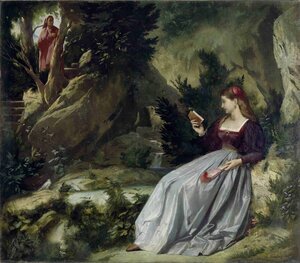 In der Bildmitte sitzt der sterbende Dante Alighieri (1265-1321) in einem Sessel mit hoher Rückenlehne. Dante trägt eine rote Mütze mit Lorbeerkranz und ein rotes Gewand. Feuerbach orientiert sich bei der Darstellung des großen Dichters höchstwahrscheinlich an dem bekannten Porträt Sandro Botticellis aus der Zeit um 1495 oder einer Darstellung Andrea del Castagnos (Uffizien) um 1450. Um den Sterbenden herum befinden sich stehende oder knieende Männer und Frauen, darunter auch ein Mönch, die sich betend und trauernd versammelt haben, um sich zu verabschieden. Links oben im Bild erscheint in einer Gloriole Beatrice, die auf den Sterbenden blickt und von kleinen musizierenden Putten auf einer Wolkenbank begleitet wird. Dabei geht es Feuerbach um die Bedeutung des Spirituellen und der Liebe im letzten Lebensmoment des Küntlers. Vorbild für die Erscheinung Beatrices ist die Sixtinische Madonna Rafaels. Das Werk ist links unten signiert und datiert: "A. Feuerbach. 1858". zu Feuerbach siehe auch https://de.wikipedia.org/wiki/Anselm_Feuerbach