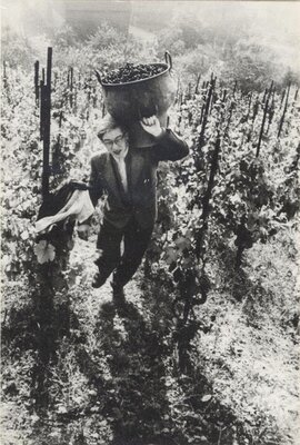 Die Winzerin steht neben einer mit Trauben gefüllten Bütte und hält einen ebenfalls mit Trauben gefüllten Korb im Arm. Eine Brust ist ganz, eine leicht entblößt. Ihr Kleid besteht aus einem grün-, purpur- und goldgestreiften Mieder, einem mehrlagigen Rock in den gleichen Farben und mit Blumenmuster darauf. Sie ist barfüßig. Vgl. Gegenstück der Wengert-Winzer Blaumarke CC. Ludwigsburg. Modell von Jean Jacques Louis