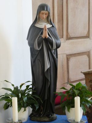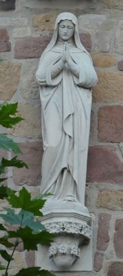 Maria trägt ein Kopftuch, das bis zur Hüfte reicht und die Schultern bedeckt. Unter dem Kopftuch trägt sie eine Haube, die die Haare und den Hals vollständig verdeckt. Sie ist gekleidet in ein bodenlanges in Falten gelegtes Kleid. Darüber trägt sie einen langen Mantel, der bis zum Boden reicht und den sie vorne etwas nach oben anhebt. Das rechte Bein ist leicht angewinkelt und steht hinter dem linken. Die Hände sind vor der Brust gefaltet (Handflächen sind aneinander gelegt). Das Gipsmodell ist mit metallenen Messpunkten versehen. In Stein gefertigt steht sie außen an der Kirche St. Nikolaus in Bellheim und in Holz gearbeitet und bunt gefasst steht sie als Hildegard von Bingen in der Pfarrei in Bellheim.