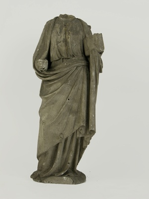 Petrus mit Himmelsschlüssel in der linken Hand. Er trägt ein Untergewand mit einer Schärpe, die an der rechten Hüfte gebunden ist. Der Mantel reicht über die linke Schulter, unter dem rechten Arm hindurch und ist um den rechten Unterarm geschlungen. Die rechte Hand hält ein Buch, die linke Hand rafft den Mantel und hält gleichzeitig den Schlüssel. Die Figur ist barfuß. Buch und Schlüssel sind Attribute des Petrus. Der Kopf fehlt.