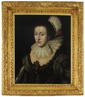 Porträt von Friedrich V. (* 26. August 1596 im Jagdschloss Deinschwang bei Neumarkt in der Oberpfalz; + 29. November 1632 in Mainz). Ab 1610 war er Kurfürst von der Pfalz und 1619/20 kurzzeitig König von Böhmen. 1623 verlor er Königs- und Kurwürde. Ab 1621 befand er sich mit seiner Familie im Exil in den Niederlanden. Es handelt sich um ein Brustbild vor rostbraunem Oval, das nach rechts gewendet ist. Friedrich V. wird dargestellt in reichbesticktem Wams mit Spitzenkragen. Auf der Brust hat er eine granatbesetzte Schmuckagraffe, die in Gold gefasst ist. Das Bild ist vermutlich nach 1621 (Beginn des Exils im niederländischen Den Haag) und vor 1632 (Tod in Mainz) in den Niederlanden entstanden. Pendant zu HM_1986_0053_b