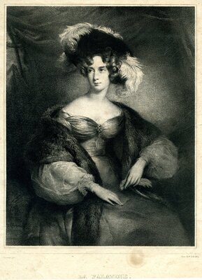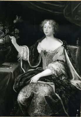 Porträt von Elisabeth Stuart (*19. August 1596 im Falkland Palace, Fife, Schottland; + 13. Februar 1662, Westminster, London). Als Gattin von Friedrich V. von der Pfalz auch Kurfürstin von der Pfalz und Königin von Böhmen. Brustbild vor rostbraunem Oval nach links gewendet. Elisabeth wird dargestellt in reichbesticktem Kleid mit Spitzenkragen, Federhaube am Hinterkopf, Perlenband und Granatschmuck im Haar. Am linken Ohr trägt sie Schmuck mit einer sehr großen weißen und schwarzen Perle. Auf der Brust befindet sich eine granatbesetzte Agraffe. Das Bild ist vermutlich nach 1621 (Beginn des Exils im niederländischen Den Haag) und vor 1632 (Tod in Mainz) in den Niederlanden entstanden. Pendant zu HM_1986_0053_a