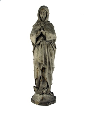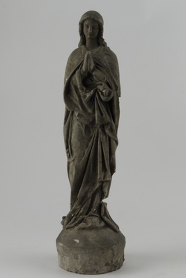 Dargestellt ist die Maria Immaculata. Sie steht barfuß auf einer Mondsichel, die wiederum auf einer Halbkugel liegt, die die Weltkugel symbolisiert. Um die Halbkugel windet sich eine Schlange. Gekleidet ist sie in eine bodenlange Tunika. Darüber trägt sie einen vorne offenen, weiten, faltenreichen Umhang, der über der Brust mit einer Brosche zusammengehalten wird. Die Brosche ist ein auf der Spitze stehendes Quadrat, das nicht flächig, sondern durchbrochen ist. Vier Stege in diesem Quadrat halten in der Mitte einen quadratisch, pyramidal geschliffenen Edelstein. Marias Haupt ist verhüllt mit einem Schleier, der auch die Schultern bedeckt. Über dem Schleier trägt sie eine Haube und darüber eine Krone. Ihr Blick ist nach unten gerichtet. Mit ihrer linken Hand, die unter dem Umhang hervorragt, rafft sie diesen nach oben. Auf ihrem angewinkelten, rechten Arm sitzt das Jesuskind mit kurzem Haar. Es hält mit beiden Händen eine Kugel, Weltkugel, nahe am Herzen auf der Brust fest. Seine Augen sind offen und auf den Betrachter gerichtet. Diese Darstellung geht auf die Beschreibung einer Frau aus der Offenbarung des Johannes zurück.