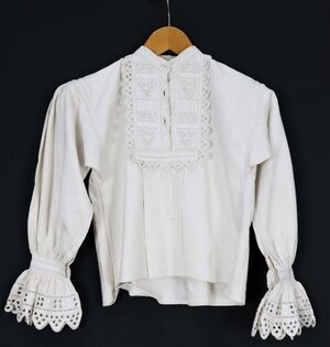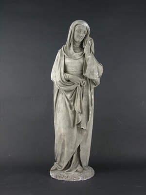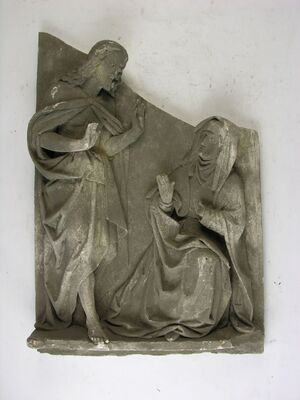 Unter einem Rundbogen, der sich nach hinten ins Freie öffnet, sitzt nach links eine Frauengestalt, das Haupt etwas geneigt, linker Arm aufgelehnt, roter Mantel, unter dem linken Arm herabfallend aufgestaucht. Zu Füßen der Frauengestalt bzw. seitlich hinter ihr auf dem Plattenboden liegender Hund, der zu ihr aufsieht. Halbrechts von der Sitzenden beugt sich eine zweite, sitzende Frauengestalt vor und reicht der nach links Sitzenden ein nacktes Kind auf den Schoß. Ganz links liegen Stoffballen oder übereinanderliegende Gewänder. Im Hintergrund unter dem Bogen sieht man die unteren Schäfte zweier großer Säulen, dazwischen blauer Himmel und rechts Baumlaub. Auf dem Boden steht die Inschrift: Im Zwickel links "Goldenes", im Zwickel rechts "Zeitalter".