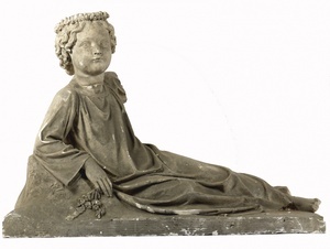 Dargestellt ist ein auf einer rechteckigen Unterlage, einer Art Matraze, liegendes, schlafendes Kind. Der gesamte Körper des Kindes ist leicht nach links gedreht. Der Oberkörper, liegt auf einem rechteckigen Kissen, an dessen vier Ecken Quasten befestigt sind. Das lockige Köpfchen des Kindes ruht auf seinem linken Arm, unter dem zwei Blumen liegen. Sein rechtes, angewinkeltes Ärmchen liegt über der Brust. Die linke Hand ist geöffnet und weist nach unten. Gekleidet ist das schlafende Kind in ein langes, weites Hemdchen mit langen Ärmeln. Die Füßchen ragen nackt unter dem Hemd hervor. Vermutlich handelt es sich bei der Plastik um ein Modell für ein Kindergrab.