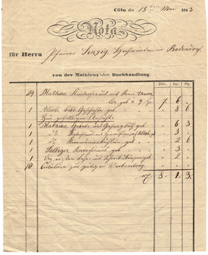Brief der Mathieux Buchhandlung in Köln an Pfarrer Sinzig in Bodendorf