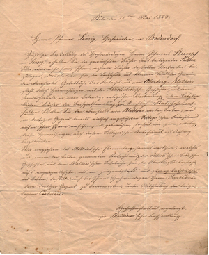 Brief und Umschlag auf einem Blatt 257 x 420 mm. Das Blatt wurde halbgefaltet, zu einem Format 85 x 120 mm zusammen gefaltet und mit einem Siegelwachsstempel verschlossen. Im Brief wurden zwei Rechnungen der Matheux´schen Buchhandlung beigelegt. Abgestempelt wurde der Brief in Köln.