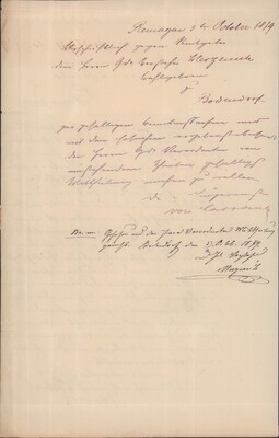 Schreiben der Rheinischen Eisenbahngesellschaft an Bürgermeister Lassaux zum Kauf des Geländes für einen Bahnhof in Bodendorf
