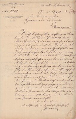 Am 23. September 1879 erging eine Ministerialverfügung zum Bau der Ahrtalbahn von Remagen bis Altenahr. Der Brief, mit zweieinhalb Seiten handschriftlichen Text, vom Direktor der Rheinischen Eisenbahn-Gesellschaft vom 27.9.1879 an den Bürgermeister von Remagen Lassaux handelt von den Verkaufsmodalitäten des Geländes neben der Bodendorfer Burg. Die Burgbesitzerin, Frau von Grothe, erhielt 900 Mark für das Grundstück neben der Bodendorf Burg für die Errichtung eines Bahnhofs. Als Bedingung handelte Frau von Grohte mit der Eisenbahngesellschaft aus, dass sie einen direkten Zugang zum Bahnhof mit einer Pforte in der Burgmauer und einen eigenen Wahresaal erhielten. Ein knappes Jahr später, am 17. September 1880, eröffnete die Rheinische Eisenbahn das erste Teilstück von Remagen nach Ahrweiler, das am 1. Dezember 1886 bis Altenahr und am 15. Juli 1888 bis Adenau weitergeführt wurde. Der Briefbogen ist halb gefaltet zu Seiten 330 x 210 mm. Eine Hälfte ist beidseitig beschrieben und eine Seite wurde als Umschlag beschrieben und gefalten zum Format zum Format 90 x 162 mm. Verschlossen wurde der Brief miz einem Papiersiegel.