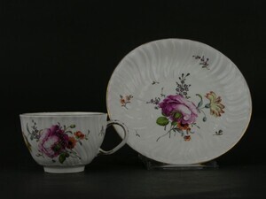 Ein ovale Platte mit gold-blau verziertem Rand. Bemalt ist sie mit verschiedenen Blumen und Früchten in bunten Farben. Der Rand ist reich profiliert: unterteilt ist er in zwölf Abschnitte, zwölffach wechselnd, sechs gerade und sechs doppelwellige Abschnitte. Entsprechend gestaltet ist der innere Rand. Das gold-blaue Band ziert einmal den äußeren Rand und einmal den Rand des Spiegels. Die Kehle hat einen Wellenrand mit sechs Einbuchtungen die aus drei Graten und zwei Rillen bestehen. Den Spiegel ziert ein großes Früchte-Blumen-Arrangement. Weiße Trauben, Pfirsich, Apfel, zwei Pflaumen, Erdbeeren, Nüsse und eine purpurfarbene Rose. Etwas seitlich vom großen Arrangement sind blaue Weintrauben und eine Birne. Aus einem Speiseservice. Blaumarke CT 82. Eingeritzt.
