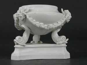 Eine Neufrankenthaler Gruppe aus Nymphenburg. Eine stehende Chinesin mit einem Sonnenschirm, rechts daneben sitzend ein rauchender Chinese. Im Mittelpunkt eine grün-weiße Vase. Beide sind in bunte Gewänder gekleidet, mit Streublumenmuster. Die Frau lehnt mit einem Arm an der Vase, mit der anderen hält sie den über die Schulter gelegten Schirm fest. Der Mann sitzt auf der anderen Seite auf dem Boden, an die Vase gelehnt, in einer Hand die lange Pfeife haltend an der er zu ziehen scheint.