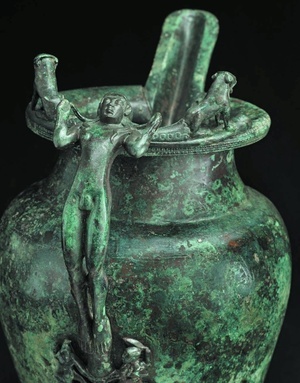 Etruskischer Dreifuß aus dem keltischen Fürstengrab von Bad Dürkheim: Der - nach älterer Interpretation vielleicht als Ständer für einen Weinmischkessel dienende - Dreifuß, der im ersten Viertel des 5. Jh. v.Chr. in Vulci in Mittelitalien entstand, ist das bedeutendste Stück etruskischer Bronzekunst, das in antiker Zeit über die Alpen in den keltischen Norden gelangte.
