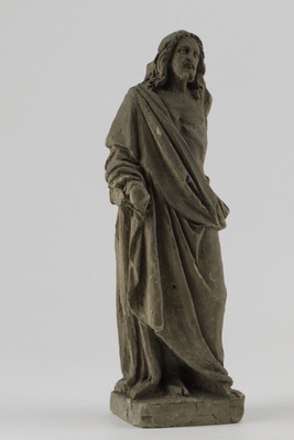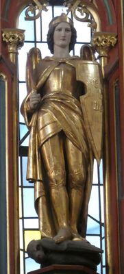 Gewandfigur auf einer flachen, runden Basis stehend. Der Erzengel Michael als Paradieswächter, mit kurzem Haar und Diadem. Er trägt eine Rüstung und darüber einen bodenlangen Umhang, der nur die Schultern und den Rücken bedeckt. Der rechte Arm hebt den Mantel, der mit Zierbordüren an den Säumen versehen ist, seitlich nach oben. Die rechte Hand ist abgebrochen. Über der Brust wird der Mantel mit einer Fibel zusammengehalten. Der linke Arm ist verdeckt durch einen Langschild, der nach unten spitz zuläuft und etwa bis Mitte Oberschenkel reicht. Im oberen Drittel ist eine runde Aussparung. Auf dem Schild ist eine Inschrift aufgebracht "Quis ut Deus" („Wer denn anderes als Gott"). Unter dem Umhang trägt er einen eng anliegenden Panzer, der den gesamten Körper (Beine und Füße) bedeckt. Ein Tuch, das schräg um die Hüfte gelegt ist, bedeckt nur die linke Seite. Auf dem Rücken befinden sich lange, zusammengelegte Flügel, die jedoch stark beschädigt sind. Der Erzengel Michael steht auf einem geflügelten Untier, dessen Hals und Kopf vom Betrachter aus gesehen links nach unten fällt. In die Skulptur sind metallene Messpunkte für den Bildhauer eingelassen. Die ausgearbeitete Skulptur in Holz und bemalt, steht im Seitenschiff rechts in der Pfarrkirche St. Nikolaus in Bellheim und anders gestaltet auf dem Hauptaltar links oben in der Kirche St. Marien Neustadt/W.