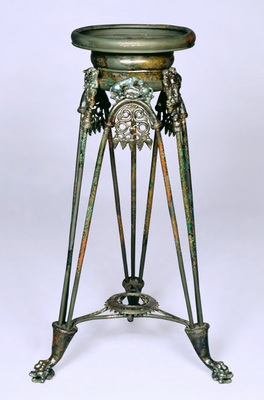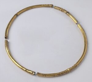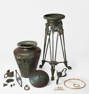 Goldener Armring aus dem keltischen Fürstengrab von Rodenbach: Angeregt durch den Bild- und Ornamentschmuck der importierten mediterranen Luxusgüter schufen im 5. Jh. v.Chr. keltische Kunsthandwerker an den Höfen der Aristokratie eine neue Form-, Bild- und Ornamentsprache, die die gesamte keltische Welt erfaßte und - sich wandelnd und verfeinernd - fortan prägte. Der Goldschmuck aus den keltischen Fürstengräbern von Rodenbach und Bad Dürkheim (Bild S. 4) gehört zu den frühen Spitzenleistungen des neuen Stils und läßt zugleich etwas vom Prozeß der Stilfindung erkennen. Beim Armring von Bad Dürkheim war der Goldschmied noch bestrebt, das gräkoetruskische Vorbild des jugendlichen Satyrkopfes unmittelbar, ohne gewollte Umstilisierung wiederzugeben. Die Abweichungen rühren daher, daß der keltische Meister die naturhaft plastische Modellierung des Vorbildes nicht beherrscht hat (und ohne langjähriges Lernen in mediterranen Werkstätten auch nicht beherrschen konnte). Bei den Rodenbacher Ringen sind die Gesichter dagegen stark abstrahiert in gleichgewichtige, kurvolinear umrissene Formelemente aufgelöst, und beim Armring zusammen mit anderen mediterranen, gleichfalls umstilisierten Bildmotiven - das Grundmotiv ist der menschliche Kopf zwischen einem Tierpaar, wie es beispielsweise an der Schnabelkanne des Bad Dürkheimer Fürstengrabes vorgebildet ist - in eine neue komplizierte, mehrfach symmetrisch ineinander verschränkte Komposition eingebunden: typisch für die phantastisch-sinnbildhafte, aber rational gebändigte Welt keltischer Ornamentik. Den Kelten im westlichen Mitteleuropa war bis dahin figürliche, abbildende Darstellung fremd. Die Hinwendung zum Figürlichen, das Aufgreifen vegatabilischer Ornamentik (anstatt der zuvor rein geometrischen) im neuen Stil und insbesondere dessen enorm schnelle Durchsetzung erschienen der Forschung noch vor wenigen Jahren als ein revolutionäres Ereignis, erklärbar nur mit einem tiefen geistig-religiösen Umbruch. Neuere Forschungen und Funde belegen indessen, daß die Traditionslinien spätbronzezeitlicher Religion jedenfalls in ihren symbolhaften Äußerungen ins 5. und 4. Jh. v.Chr., ja bis in spätkeltische Zeit durchlaufen und daß dem neuen Stil seit dem letzten Viertel des 6. Jhs. v.Chr. eine »Experimentierphase« (W. Kimmig) der inneren Annäherung an bildhaftes Gestalten und organischeres Ornament voranging: in eher kopierendem Nachbilden osthallstättischer und mediterraner Bildwerke, im Aufgreifen gekurvter Dekorelemente und in ersten freieren Annäherungen an südliche Bildkunst (z. B. Pferdefigürchen auf dem Goldreif von Vix), bis dann bald nach 450 v.Chr. die Verquickung mediterraner Motivik mit der Zirkelschlagornamentik den stilistischen Durchbruch brachte. (Lothar Sperber)