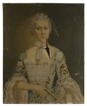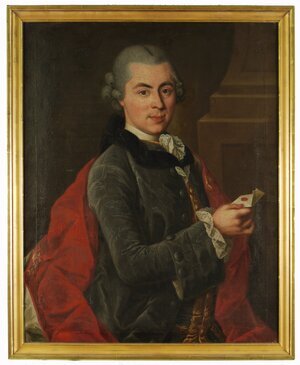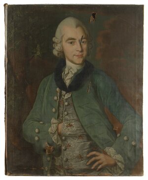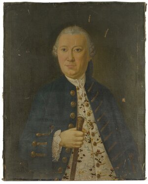 Porträt des Speyerer Bürgers Johannes Claus Halbfigur en face. Der vornehme Herr trägt eine weiße Perücke und einen blauem Rock mit Goldbesatz und eine mit bunten Blumen gemusterte Weste. In der leicht erhobenen Rechten hält er einen Spazierstock mit goldenem Knauf. Johannes Claus war der 2. Ehegatte v. Maria Magdalena Treutlinger in Speyer. Das Porträt gehört zu einem Konvolut von Porträtdarstellungen Speyerer Bürgerinnen und Bürger der Familien Treutlinger, Koch und Claus in Speyer. Die Porträts sind allesamt stark beschädigt. Einige Beschädigungen erscheinen eventuell mutwillig, beispielsweise durch Säbel oder Florett, hervorgerufen. Das Gemälde ist zusammen gehörig mit Porträts folgender Personen Philipp Friedrich Treutlinger, HM_1910_11_18_a Bildnis eines Bürgers HM_1910_11_18_b Johannes Claus HM_1910_11_18_c Bildnis Treutlinger, Maria Magdalena (1733-1785) HM_1910_11_18_d Frau A. Koch, gebürtig in Regensburg HM_1910_11_18_e Herr Koch aus Speyer HM_1910_11_18_f
