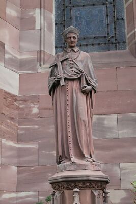 Das Gipsmodell stellt Karl Borromäus dar, der im 16. Jh. Kardinal und Erzbischof von Mailand war. Das Modell zeigt ihn als Kardinal mit dem typischen Birett auf dem Haupt, einem bodenlangen Talar und der Mozetta, ein Schulterkragen mit kleiner Kapuze. Über der Mozetta hängt ein Brustkreuz an einer langen schweren Kette. Mit der rechten Hand hält er ein nicht ganz vollständig holzfarben eingefärbtes Kreuz. In der linken Hand hält er ein Buch, sein linker Zeigefinger steckt zwischen den Seiten, um eine bestimmte Stelle zu markieren. Bei der Figur handelt es sich um ein Gipsmodell, das von Gottfried Renn geschaffen wurde. Der aus Österreich stammende Bildhauer kam Mitte des 19. Jahrhunderts nach Speyer, um an der Neuausstattung des Domes mitzuwirken. Er blieb hier bis zu seinem Tod und schuf auch Skulpturen für viele andere Kirchen in der Region. Auch in Frankreich sind Arbeiten von ihm zu finden, z.B. in der Kathedrale von Metz oder an der St. Georgskirche im elsässischen Hagenau. Die vorliegende Figur diente als Modell für eine in Stein ausgearbeitete Skulptur an der Chapelle Toussaint in Straßburg. Wahrscheinlich fertigte Renn nach dem Modell eine weitere Steinskulptur für das Grab von Charles François Spitz in Schilitigheim, dem Auftraggeber des Baus und der Skulpturen der Allerheiligenkapelle in Straßburg. [Johanna Kätzel]