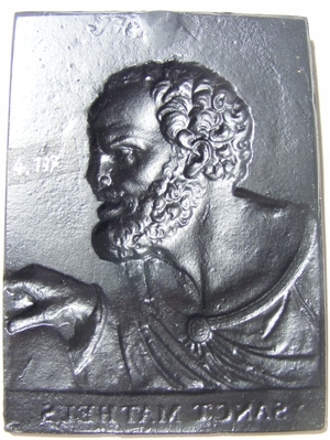 Plakette mit Brustbildrelief des Apostels Mathäus. Die Plakette trägt am unteren Rand folgende Beschriftung: "SANCT MATHEUS." Auf der Rückseite ist die Gießereimarke "S.H." für Sayner Hütte erkennbar. Es handelt sich hierbei um einen Nachguss des 20. Jahrhunderts. Das ursprüngliche Modell stammte von Bildnismodelleur Leonhard Posch, der auf Veranlassung von Oberberghauptmann Gerhard 1820 die 13 Modelle der Apostel und Christus erstellte. Diese Brustbildnisse in Eisen wurden auf allen drei königlich-preußischen Eisengießereien in Gleiwitz, Berlin und Sayn gegossen. Als Vorlage diente Posch vermutlich der Stich von Raphael Morghen aus dem Jahre 1800 nach dem "Abendmahl" von Leonardo da Vinci.