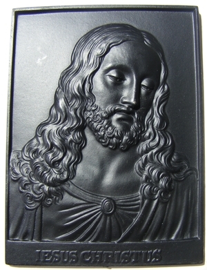Plakette mit Brustbildrelief von Jesus Christus. Die Plakette trägt am unteren Rand folgende Beschriftung: "SANCT JACOBUS. / DER JÜNGERE." Auf der Rückseite ist die Gießereimarke "S.H." für Sayner Hütte erkennbar. Es handelt sich hierbei um einen Nachguss des 20. Jahrhunderts. Das ursprüngliche Modell stammte von Bildnismodelleur Leonhard Posch, der auf Veranlassung von Oberberghauptmann Gerhard 1820 die 13 Modelle der Apostel und Christus erstellte. Diese Brustbildnisse in Eisen wurden auf allen drei königlich-preußischen Eisengießereien in Gleiwitz, Berlin und Sayn gegossen. Als Vorlage diente Posch vermutlich der Stich von Raphael Morghen aus dem Jahre 1800 nach dem "Abendmahl" von Leonardo da Vinci.