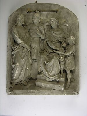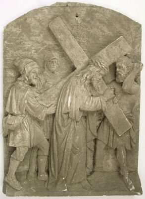 Links ein Mann in Handwerkerkleidung: über das Knie reichende Hosen, darüber eine Tunika, die über dem Knie endet, an der Taille gegürtet, die Ärmel hochgekrempelt, tiefer Halsausschnitt, mit Mütze auf dem kurzen, lockigen Haar. Rechts neben ihm ein Mann, wohl Jesus, in bodenlangem Unter- und Übergewand, der mit der rechten Hand den unteren Teil eines Kreuzes berührt. Dieser Figur fehlt der Kopf. Rechts von ihm zwei Männer, die ebenfalls Handwerkskleidung tragen: eine Hose, die kurz unterm Knie endet, ein einfaches Hemd mit hochgekrempelten Ärmeln und ein Wams ohne Ärmel. Diese helfen beim aufstellen des Kreuzes. Ganz rechts ein weiterer Mann in weitem, faltenreichen Gewand, das er um sich geschlungen hat. Er trägt ein Tuch auf dem Haupt, hat einen Bart und trägt als einziger in der Szene Schuhe. Sockelmarkierung RENN, oberer Teil fehlt. Szene aus dem Kreuzgang Jesu.