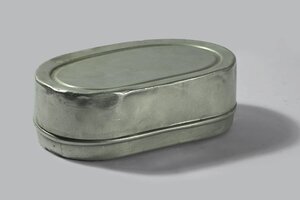 Gestanzte Brotdose oder Brotkapsel für den Transport des Frühstücksbrotes mit glatter Oberfläche in Nierenform. Die Dose ist leicht deformiert.