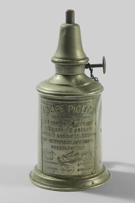 Zylindrischer Lampenkörper (Öltank) gefüllt mit watteähnlichem Gespinst und verbreitertem Fußteil. Rückseitig ist ein Griff mit Öffnung für die Wandschraube und Splintsicherung für die feste Aufhängung angebracht. Das Oberteil mit dem Docht und Rändelrad für die Dochthöhenregulierung ist zum Befüllen des Öltanks ist abschraubbar. Die Beschriftung der Lampe ist erhaben in den Lampenkörper geprägt. Die Maße sind: Durchmesser am Fuß 78 mm, Durchmesser Lampenkörper 57 mm. Der Abstand des Lampenkörpers von der Wand beträgt 23 mm. Beschriftung: LAMPE PIGEON BL' S.G.D.G. FANCE ETRANGEA A L' ESSENCE MINERALE BRULANT 12 HEURES POUR 6 CERTIMES. DROITE OU RENVERSEE.GARANTIE INEXPLOIBLE STILUEDHONN HUMANITEPROPRETE DABOUR DB FABEIQERMED ATE D'OA SECURETE ECCONOMIE
