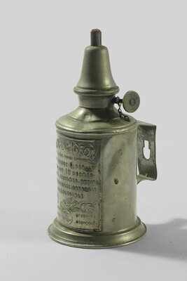 Zylindrischer Lampenkörper (Öltank) gefüllt mit watteähnlichem Gespinst und verbreitertem Fußteil. Rückseitig ist ein Griff mit Öffnung für die Wandschraube und Splintsicherung für die feste Aufhängung angebracht. Das Oberteil mit dem Docht und Rändelrad für die Dochthöhenregulierung ist zum Befüllen des Öltanks ist abschraubbar. Die Beschriftung der Lampe ist erhaben in den Lampenkörper geprägt. Die Maße sind: Durchmesser am Fuß 78 mm, Durchmesser Lampenkörper 57 mm. Der Abstand des Lampenkörpers von der Wand beträgt 23 mm. Beschriftung: LAMPE PIGEON BL' S.G.D.G. FANCE ETRANGEA A L' ESSENCE MINERALE BRULANT 12 HEURES POUR 6 CERTIMES. DROITE OU RENVERSEE.GARANTIE INEXPLOIBLE STILUEDHONN HUMANITEPROPRETE DABOUR DB FABEIQERMED ATE D'OA SECURETE ECCONOMIE