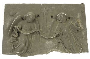 Dargestellt ist die Heilige Familie im Stall mit Krippe. Die Szene steht auf einem aus der Gipsplatte herausgeformten Sims. Maria kniet links der Krippe. Ihre Hände sind zum Gebet gefaltet. Gekleidet ist sie in eine Tunika mit einem Umhang darüber. Die langen Haare sind mit einem Kopftuch bedeckt und von einem Heiligenschein umrahmt. Josef mit Bart und langem gewelltem Haar steht rechts von der Krippe. Sein Haupt ist umrahmt von einem Heiligenschein. Er trägt ebenso eine Tunika mit einem weiten Umhang darüber. Die Hände liegen übereinander auf seiner Brust. Maria und Josef sind beide dem Jesuskind zugewandt und schauen es an. Das Kind sitzt mit nacktem Oberkörper, die Arme ausgebreitet, auf Stroh, das in einer aus Steinen gebauten Krippe liegt. Der Unterkörper des Kindes ist eingewickelt in eine große Decke, die über die Krippe hinausreicht. Das Haupt des Kindes wird umrahmt von einem Heiligenschein. Der obere Teil ist abgebrochen. Darauf sind zwei Engel in langen, wallenden Gewändern, die eine Girlande zwischen sich halten. Ihr Haar ist kurz und gelockt. In der Mitte ist der Stern von Bethlehem zu sehen. Unten am Rand sieht man einen Teil des Heiligenschein Josefs.