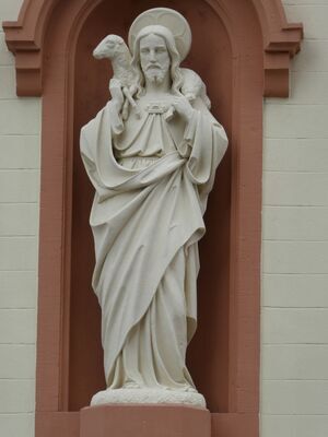 Jesus steht auf einer runden flachen Basis. Er ist mit einem Lamm auf den Schultern als "Guter Hirte" dargestellt. Sein Haar ist schulterlang und wellig. Er trägt einen Vollbart, der am Kinn in der Mitte geteilt ist. Ein Heiligenschein in Form einer Scheibe mit kleeblattartigem Ornament befindet sich hinter seinem Kopf. Gekleidet ist Jesus in ein bis zum Boden reichendes, faltenreiches und in der Taille gegürtetes Untergewand. Ein langer, in Falten geworfener Überwurf ist um den Körper drapiert und wird über der Brust durch eine Brosche zusammengehalten. Auf der Schulter trägt er ein seitwärts nach rechts blickendes Lamm mit gekreuzten Vorderbeinen. Jesus hält es mit beiden Händen an den Beinen fest. Die aus dem Modell in Stein umgesetzte Skulptur befindet sich außen an der Kirche St. Ludwig in Ludwigshafen.