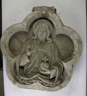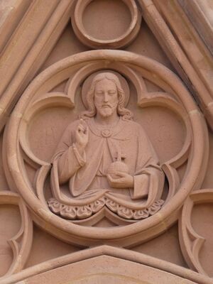 Dargestellt ist die vollplastische Büste Jesu in einem Fünfpass. Jesus trägt Vollbart und langes, welliges, in der Mitte gescheiteltes Haar. Sein Haupt umrahmt ein Heiligenschein. Er ist gekleidet in eine Tunika und darüber einen Umhang, der auf der Brust mit einer runden Brosche zusammengehalten wird. Jesus erhebt die rechte Hand zum Segen. In der linken Hand hält er einen Reichsapfel. Die Kugel steht für die Erde und das Kreuz für den christlichen Glauben. In den beiden unteren Rundungen des Fünfpasses sind ondulierende Ornamente zu erkennen, die Wolken (Himmel) symbolisieren. Das Modell in Stein ausgearbeitet findet sich außen, über dem Haupteingang der katholischen Kirche St.Vitus in Rheinsheim.