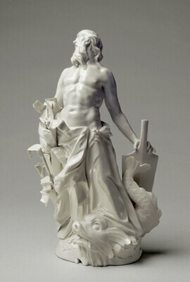 Neptun als Personifikation des Wassers. Zu seinen Füßen liegt ein großer Fisch. Hohlfigur und deswegen relativ leicht. Blaumarke CT mit B. H Nr.355.