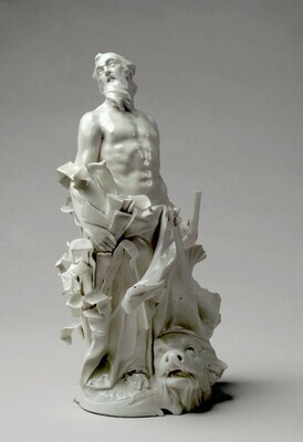 Neptun als Personifikation des Wassers. Zu seinen Füßen liegt ein großer Fisch. Hohlfigur und deswegen relativ leicht. Blaumarke CT mit B. H Nr.355.