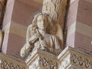 Der Oberkörper des jung anmutenden androgynen Engels steht auf einer rechteckigen Platte. Er ist mit einer Tunika mit rundem Halsausschnitt bekleidet. Sein welliges Haar ist in der Mitte gescheitelt. Sein Blick ist nach vorne gerichtet. In beiden Händen hält er ein Blasinstrument, das sich am unteren Ende erweitert. Auf dem Rücken sind Flügel zu erkennen. Vermutlich handelt es sich bei dem musizierenden Engel um den Abguss einer Figur, die der Bildhauer Josef Gasser gefertigt hat. Der Engel mit Blasinstrument befindet sich im Paradies/Kaiserhalle des Domes zu Speyer auf einem Absatz des zur Eingangspforte hin abgestuften Rundbogens, 2. Abstufung links.